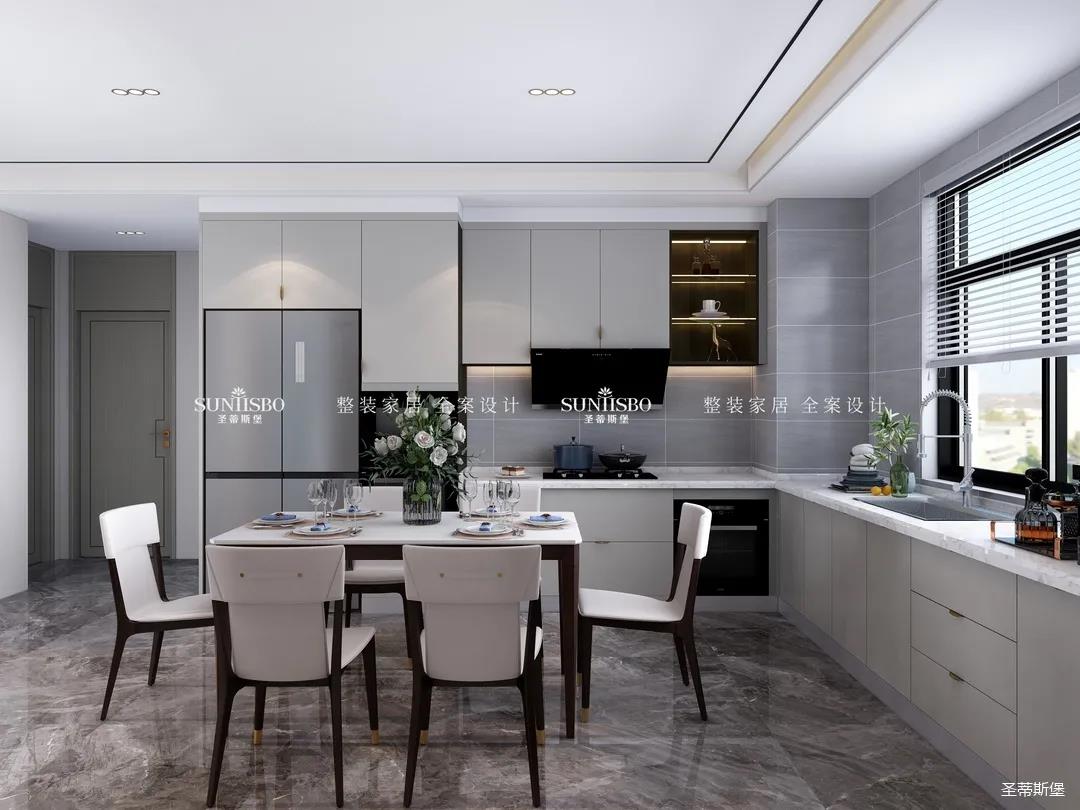 餐厨采用开放式布局,实现开阔明朗的公共空间,也提高了居家交流互动的便利性。减少不必要的物件,加上合理的设计,布局出和谐安全的居家环境。