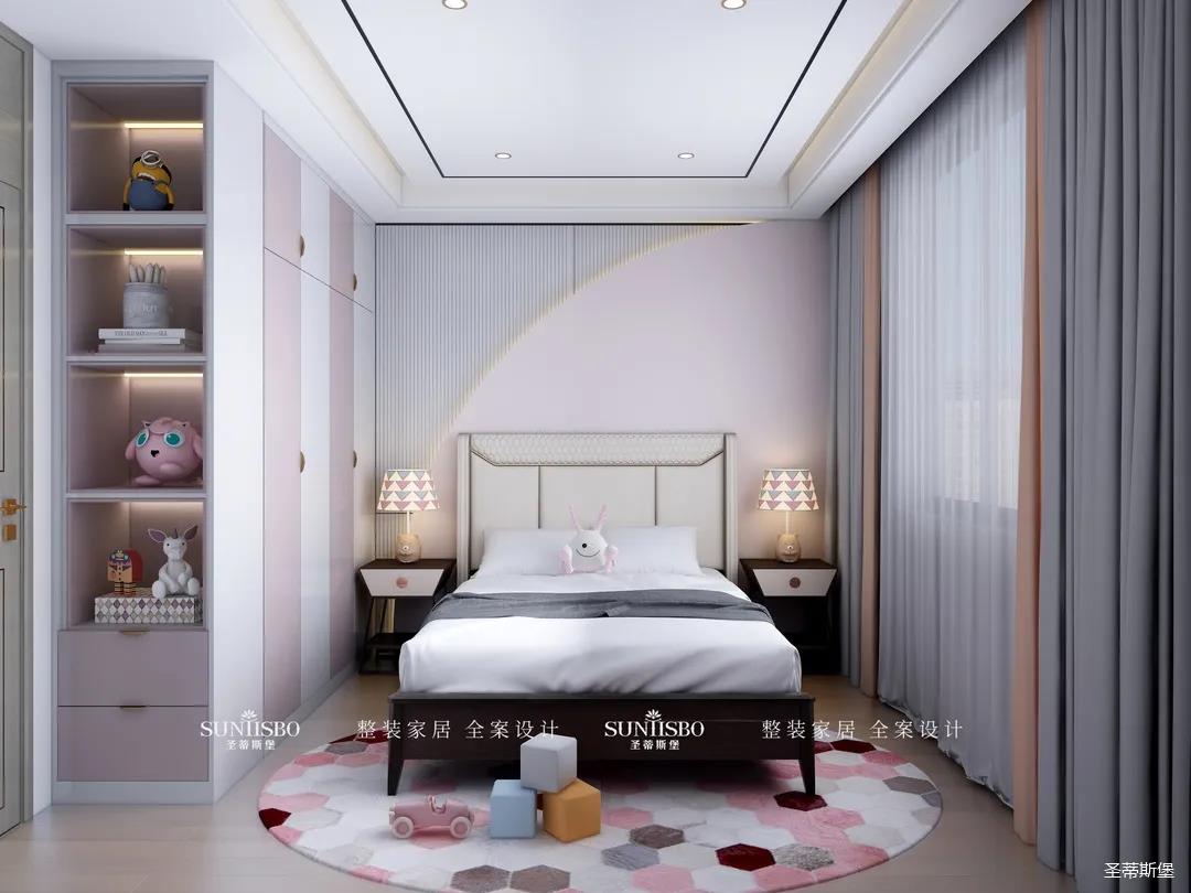 儿童房相对于其他空间更立体自然,几何纹理的床屏和床头柜延续了空间独特的设计元素,菱格形的地毯,色彩交错排列,满足了儿童房应有的童真与想象力。粉白相间的定制收纳,搭配同色系充满童趣的动物公仔摆件,俨然成为了儿童的梦幻小天地。